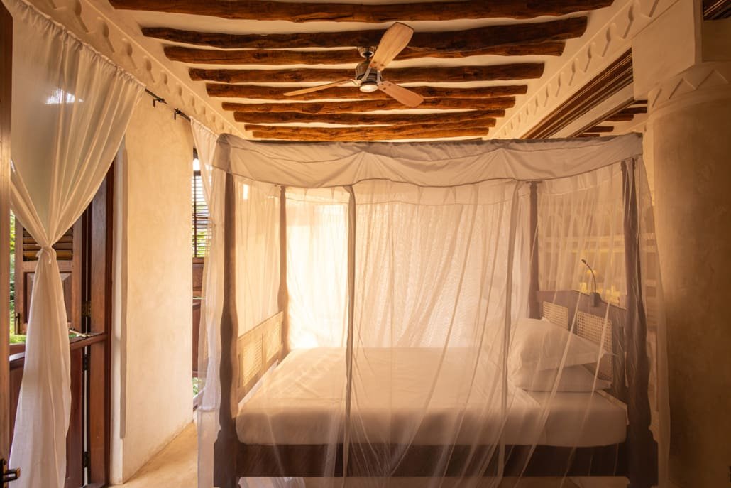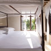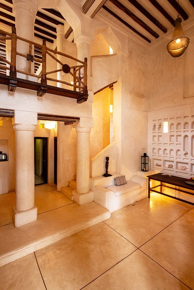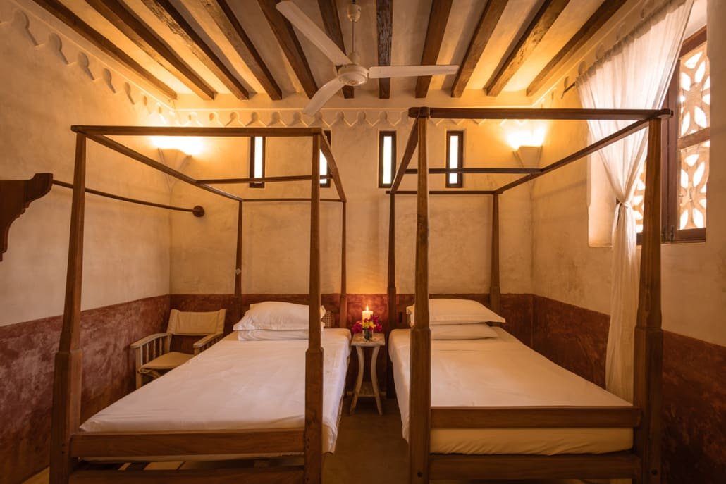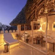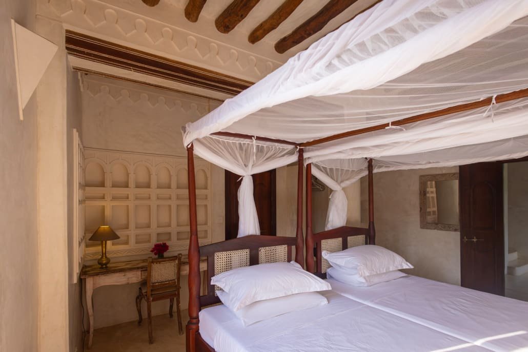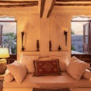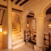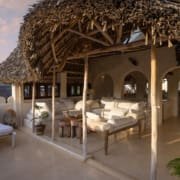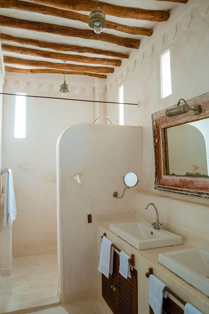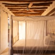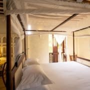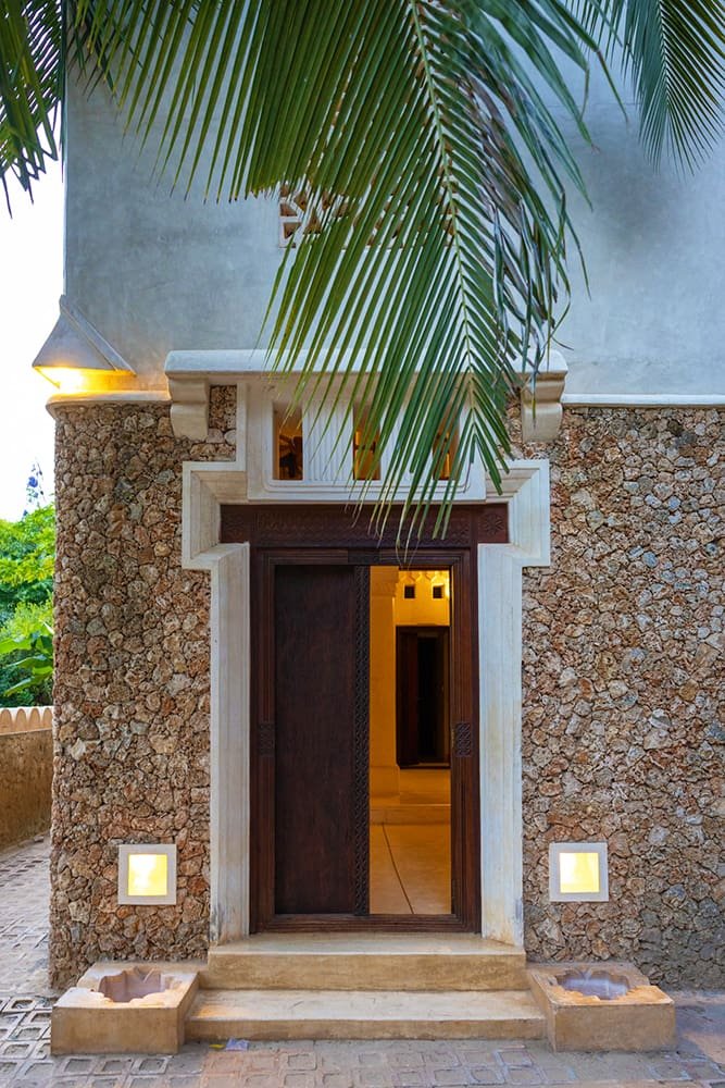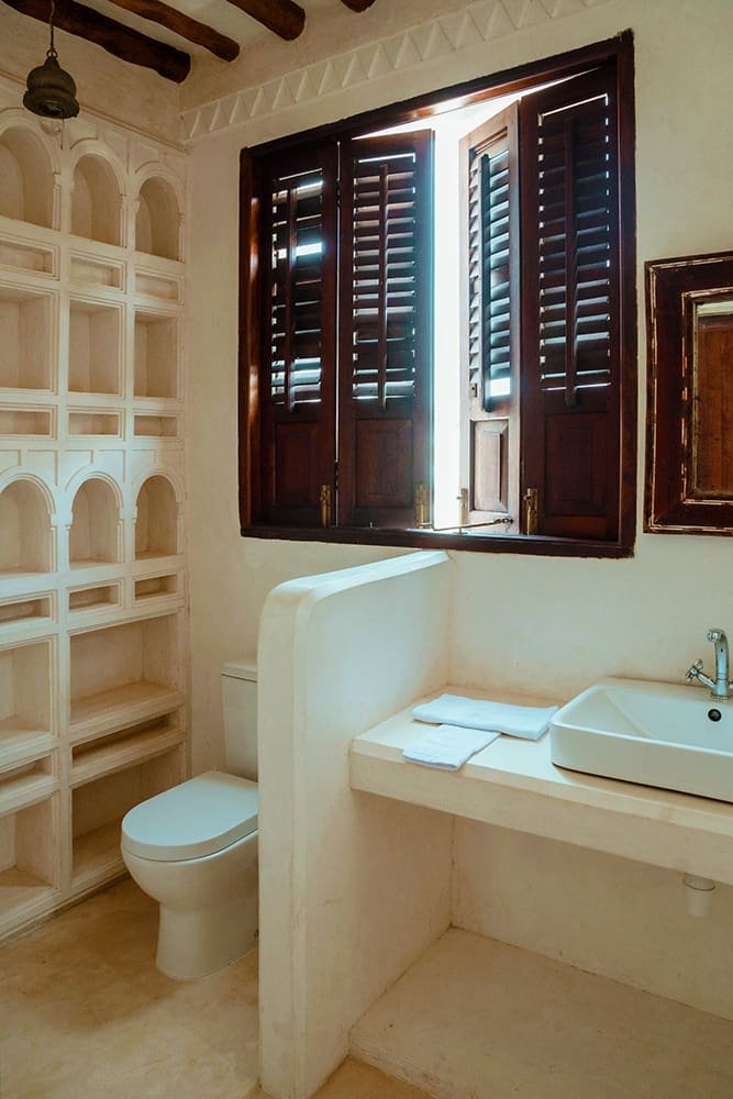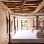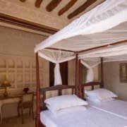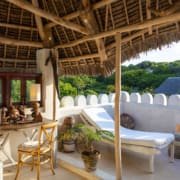 The large and lofty entrance hall is decorated in traditional Swahili style with a zidaka wall – an intricate art that has been perfected over centuries by local craftsmen – and hung with two large Arab lanterns. Its size ensures that it remains cool throughout the whole day. Leading from this is a bedroom with two single beds and an ensuite bathroom.