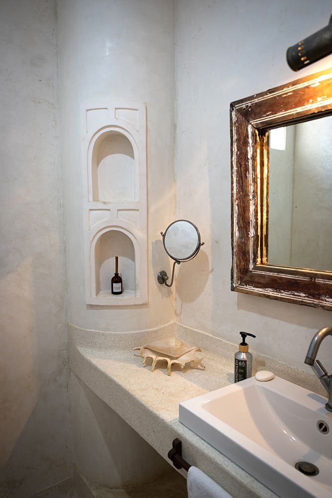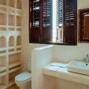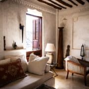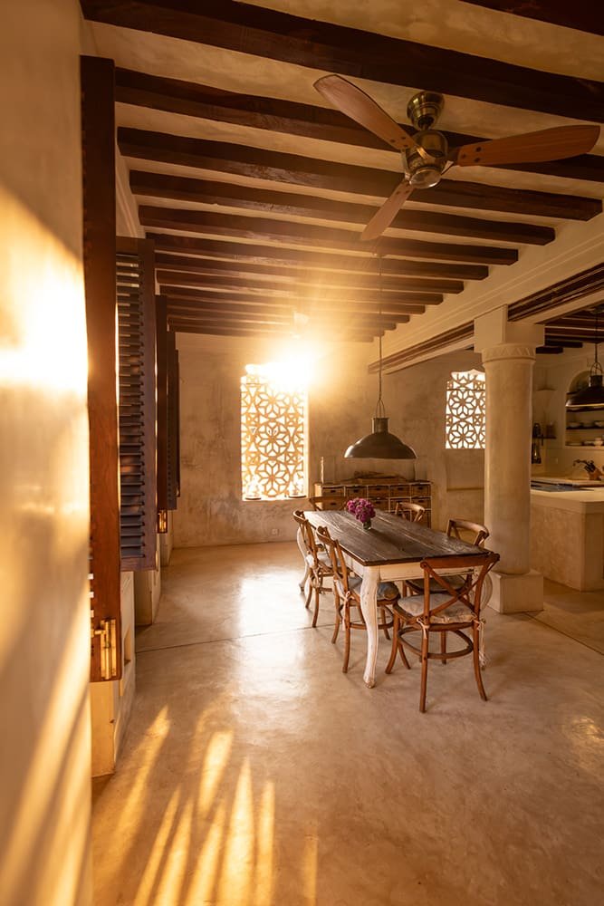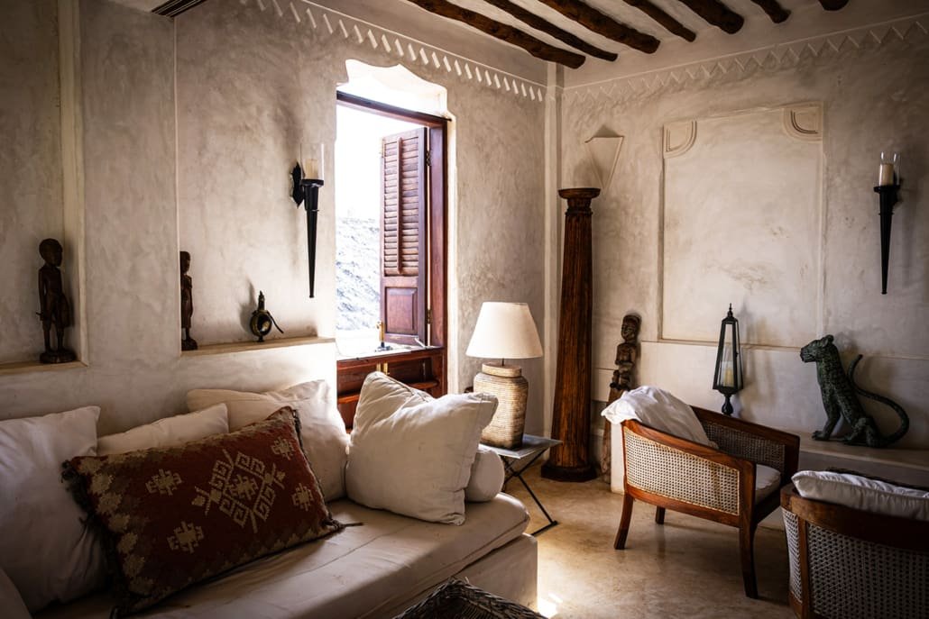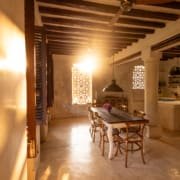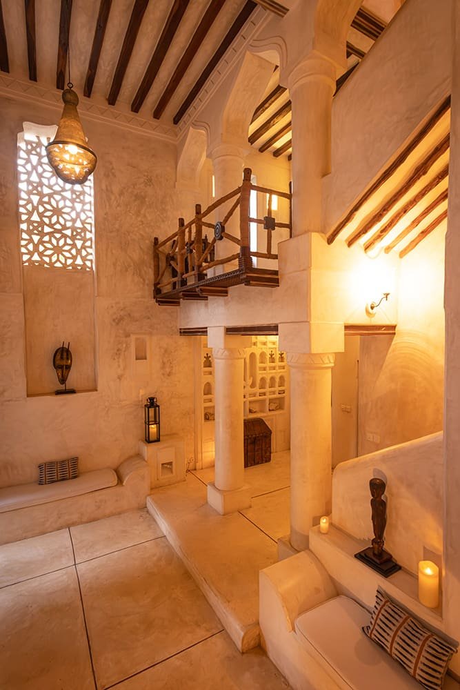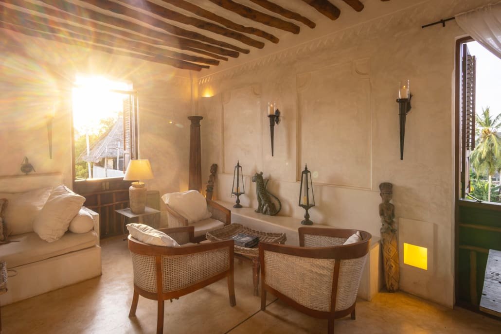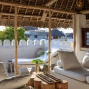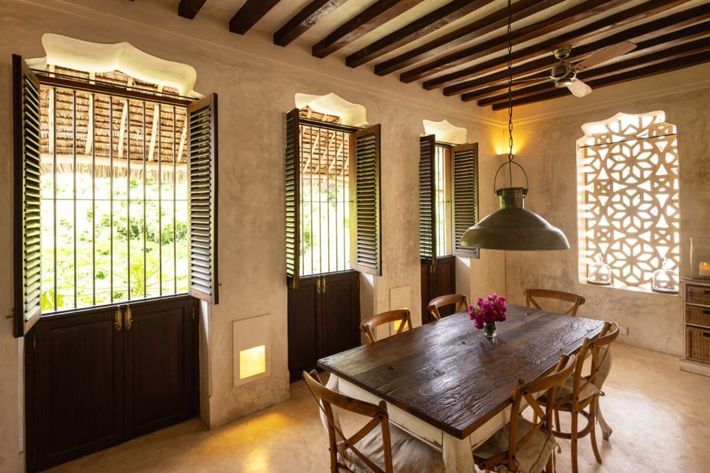 The large and lofty entrance hall is decorated in traditional Swahili style with a zidaka wall – an intricate art that has been perfected over centuries by local craftsmen – and hung with two large Arab lanterns. Its size ensures that it remains cool throughout the whole day. Leading from this is a bedroom with two single beds and an ensuite bathroom.
