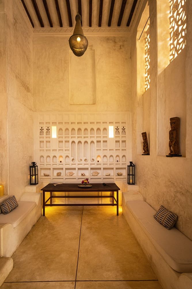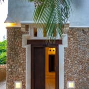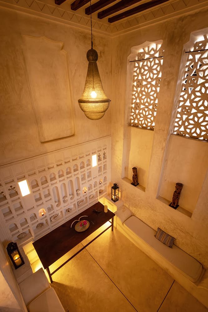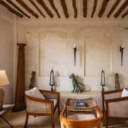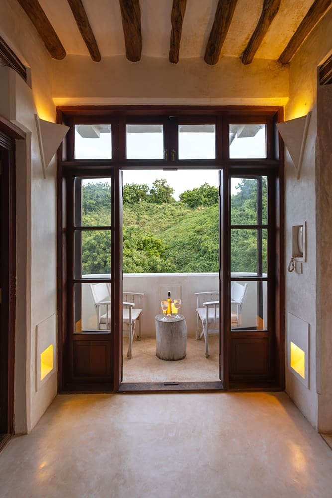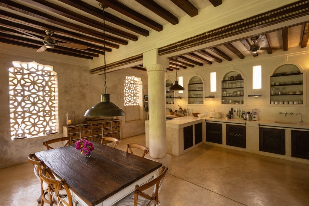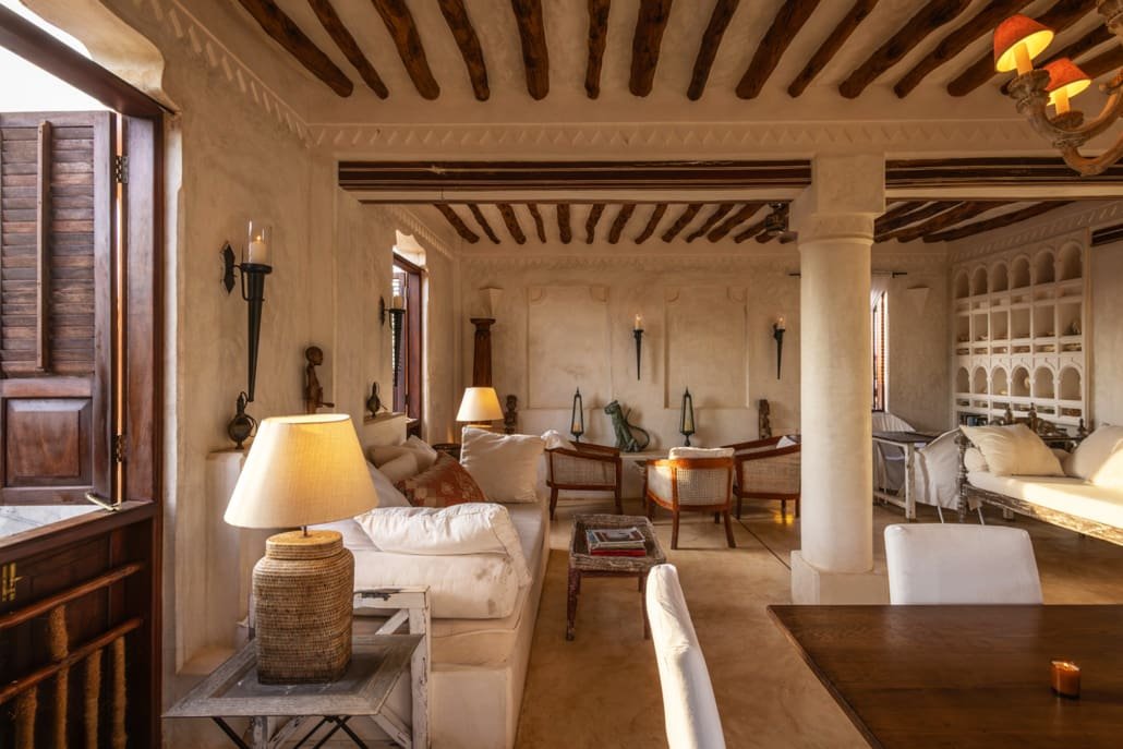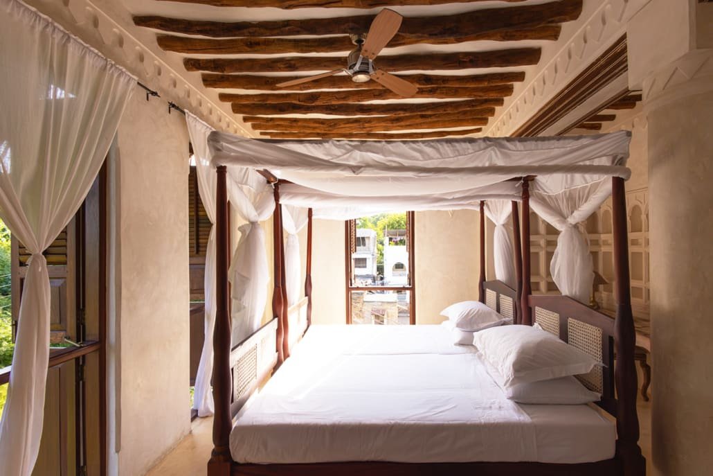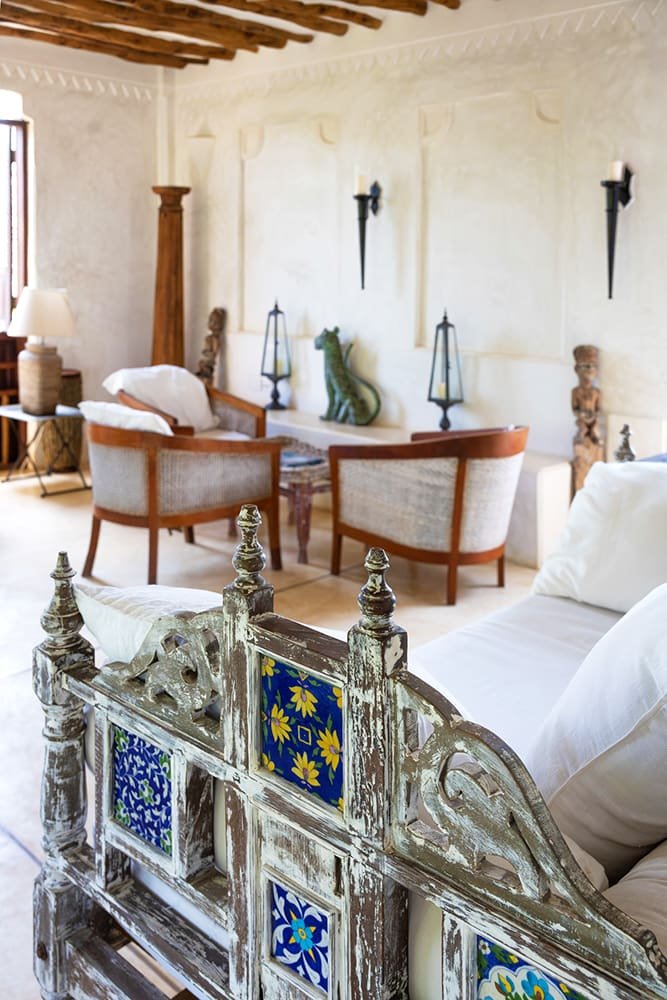 The large and lofty entrance hall is decorated in traditional Swahili style with a zidaka wall – an intricate art that has been perfected over centuries by local craftsmen – and hung with two large Arab lanterns. Its size ensures that it remains cool throughout the whole day. Leading from this is a bedroom with two single beds and an ensuite bathroom.