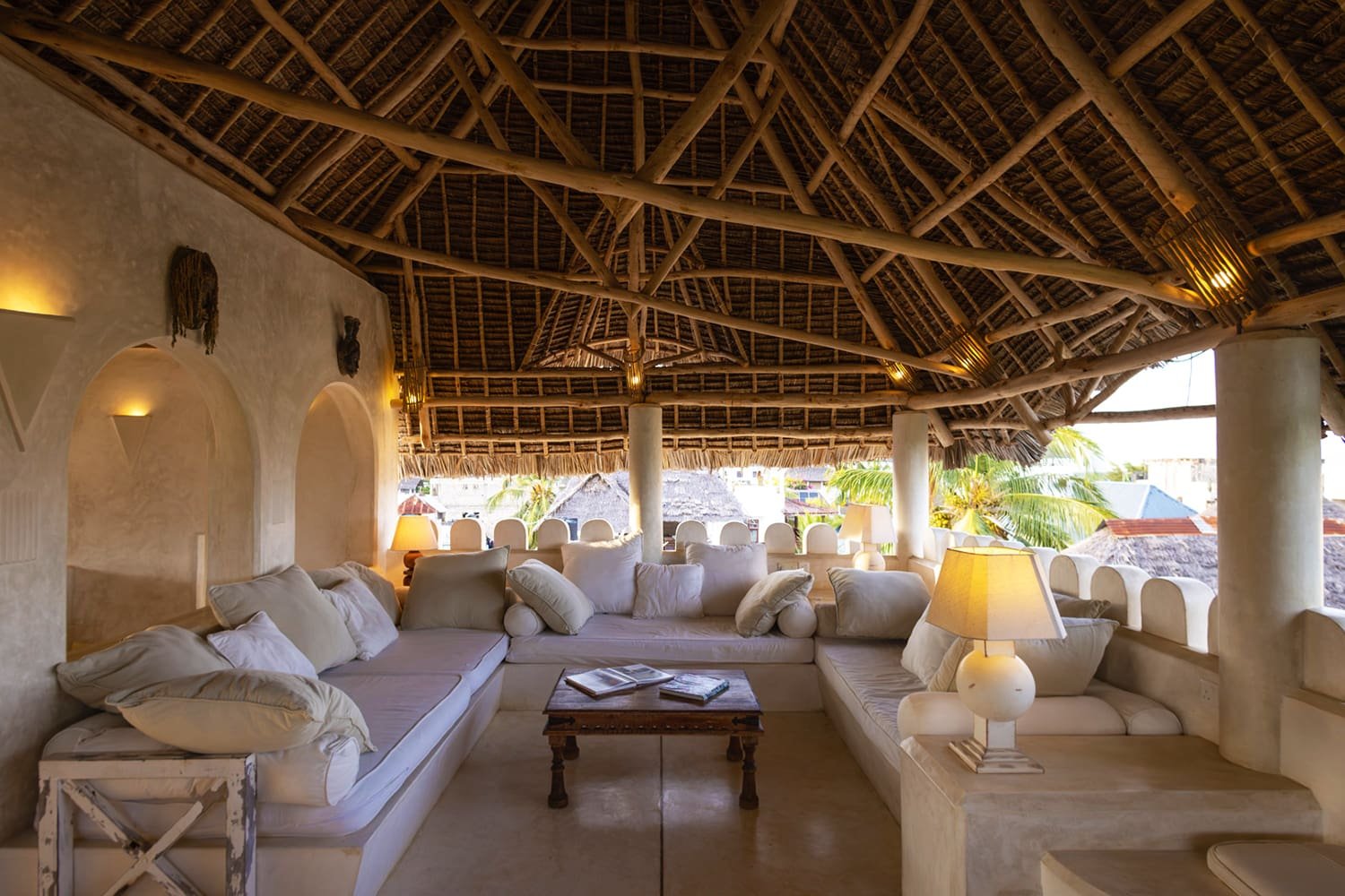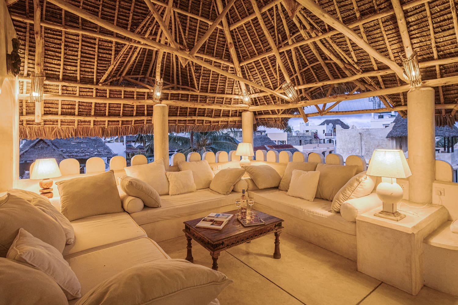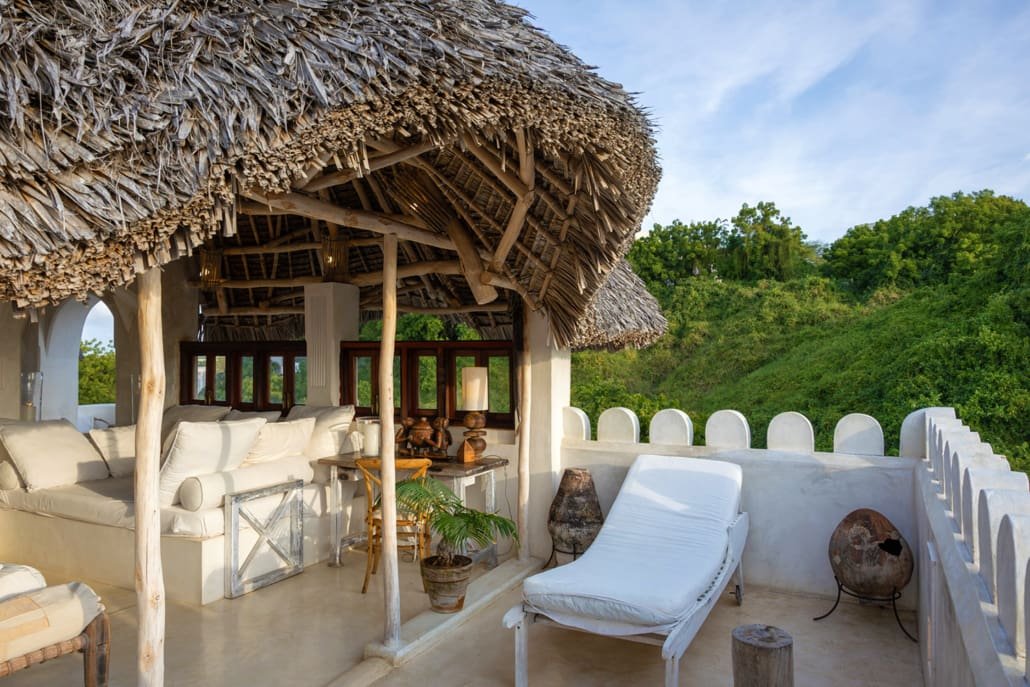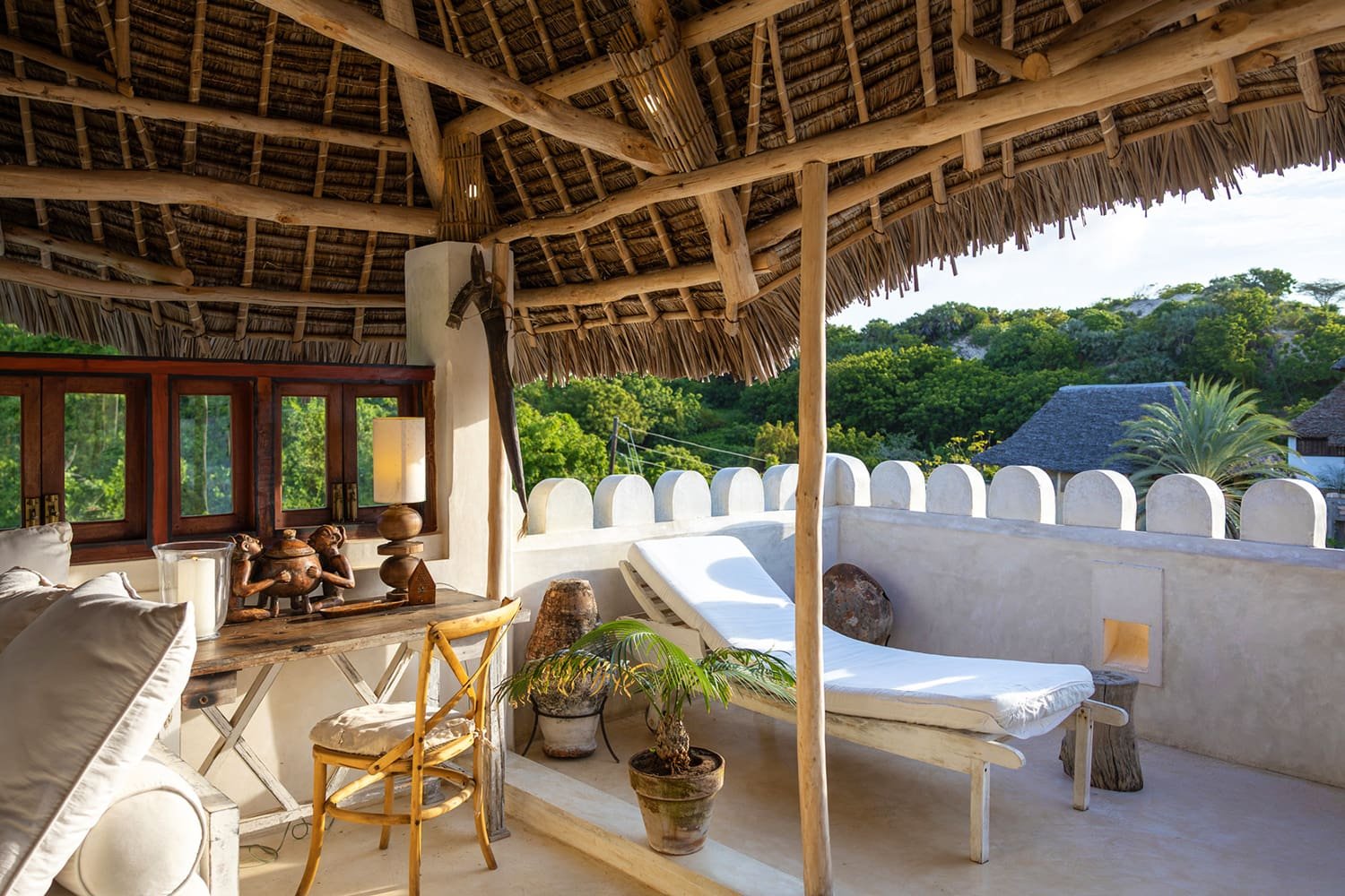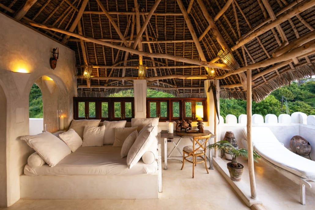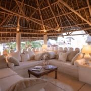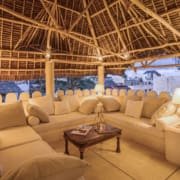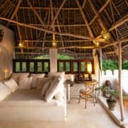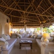 The Top Floor is completely open under a beautiful, newly-constructed makuti roof. The area is naturally divided by the central staircase allowing for two separate seating areas both with large sofas. One is constructed to allow for sun beds, the other for a dining table. There is a minibar with fridge and a writing desk with lamp.