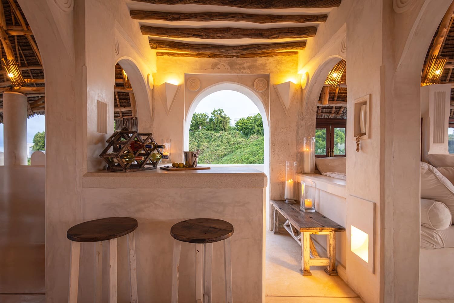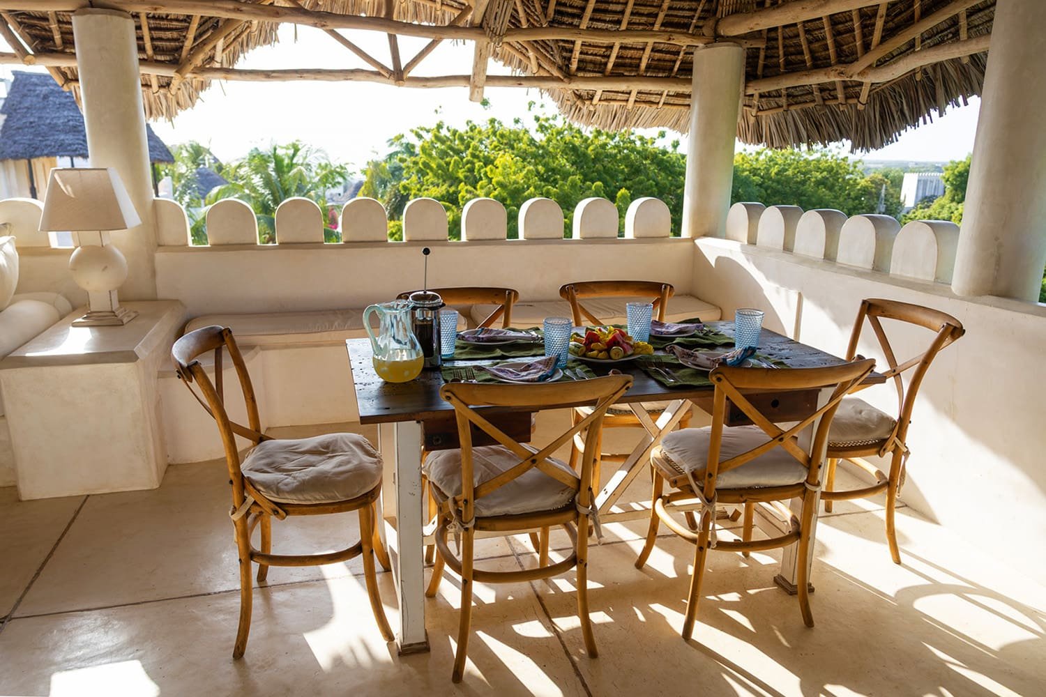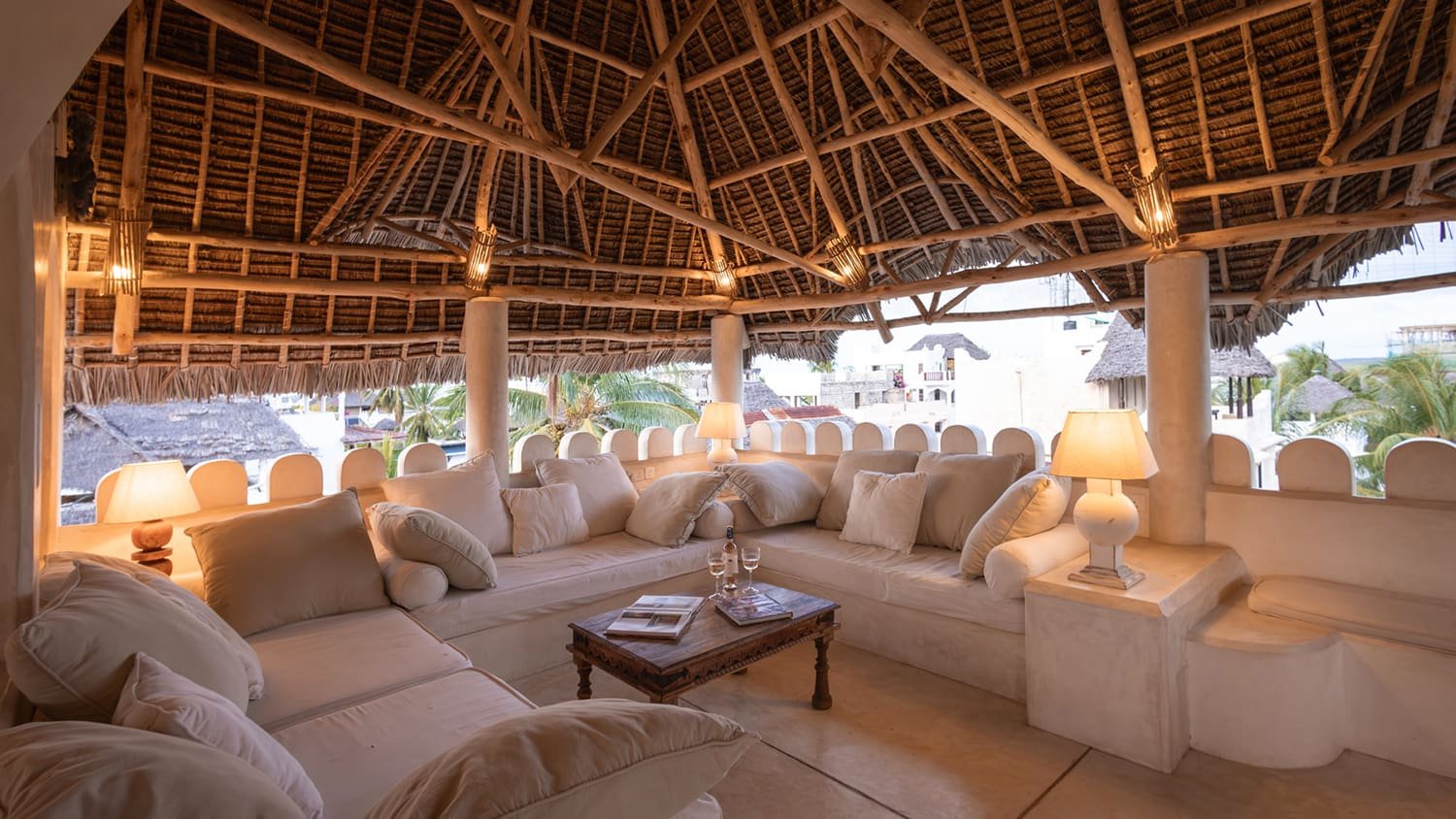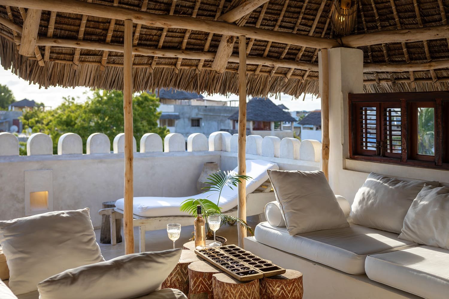 The Top Floor is completely open under a beautiful, newly-constructed makuti roof. The area is naturally divided by the central staircase allowing for two separate seating areas both with large sofas. One is constructed to allow for sun beds, the other for a dining table. There is a minibar with fridge and a writing desk with lamp.