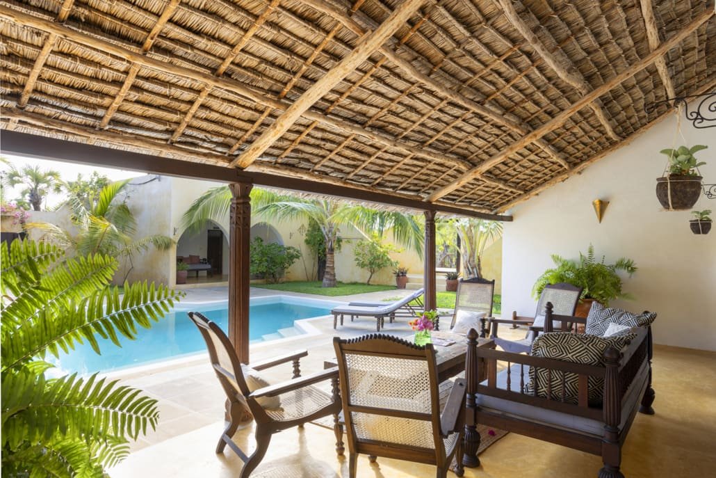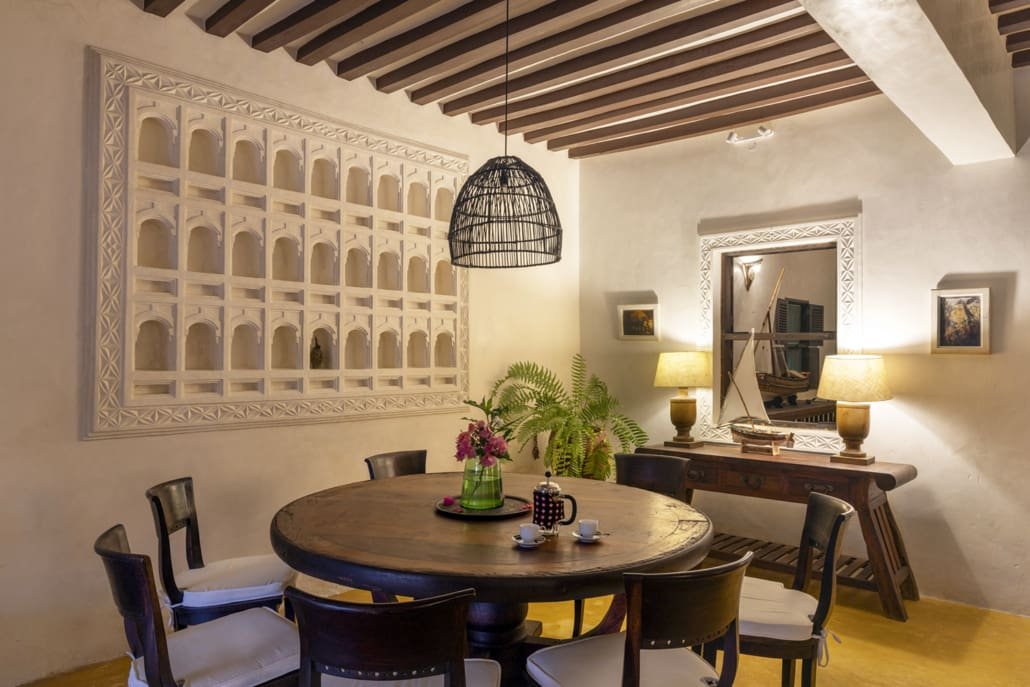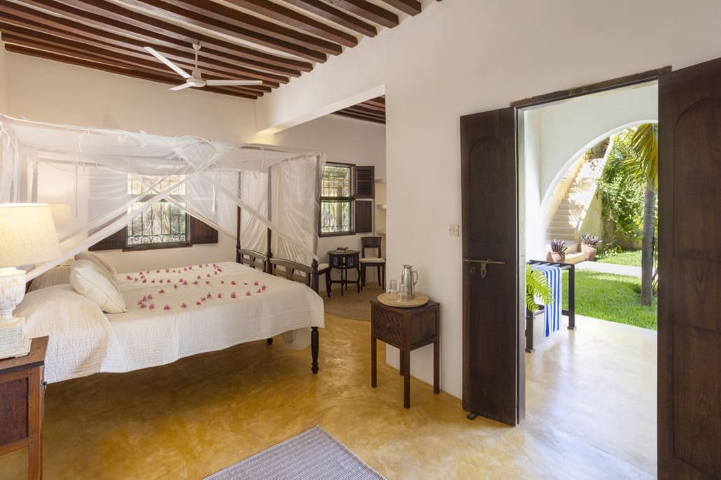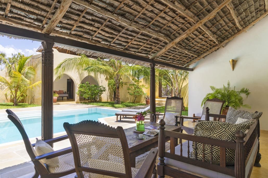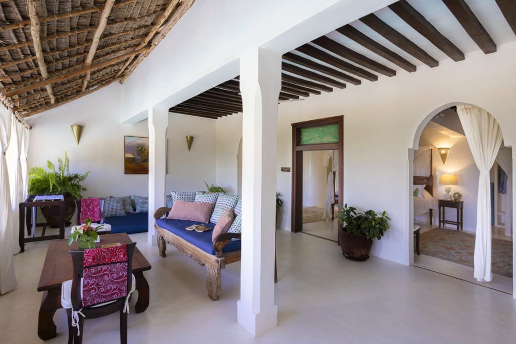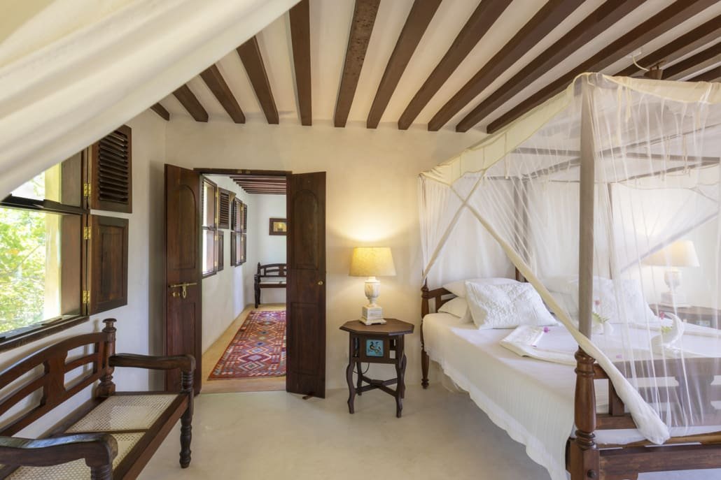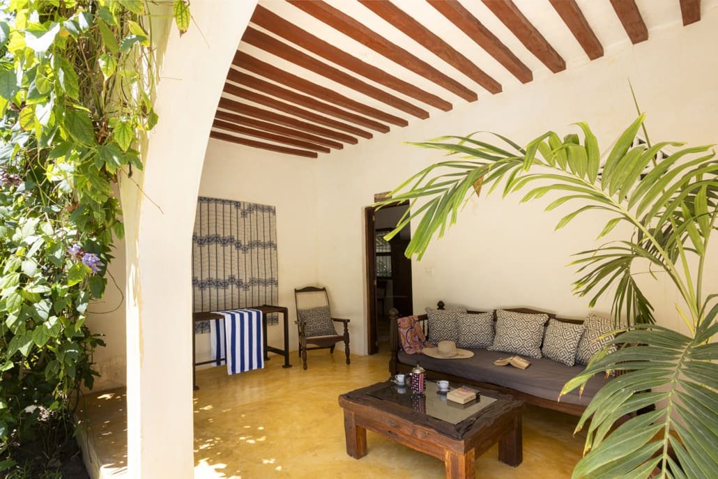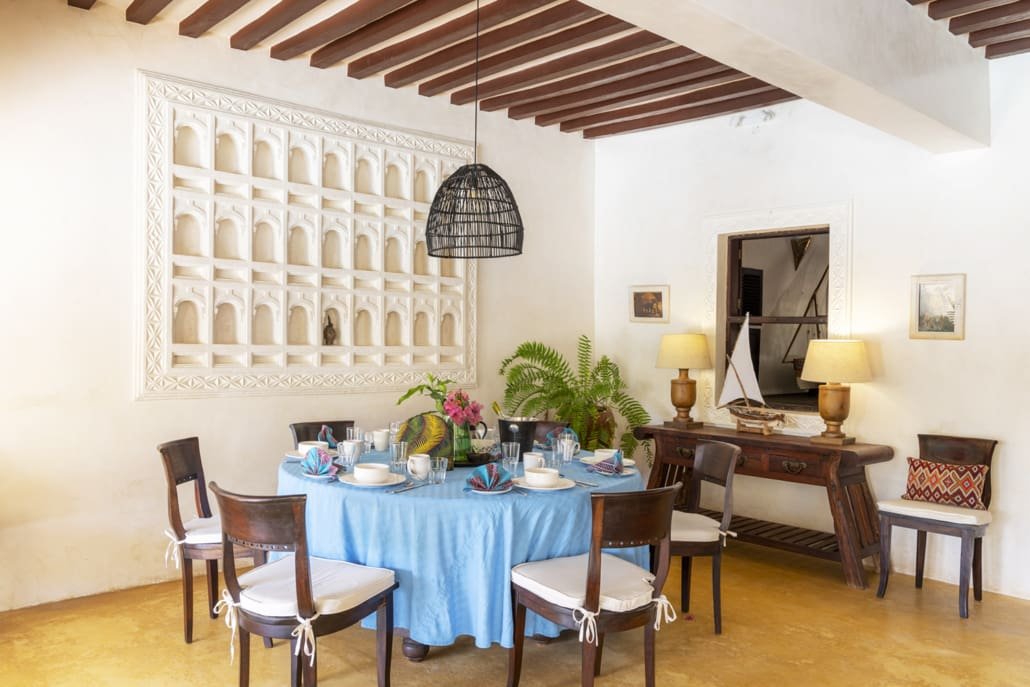 Entertaining areas are vast and cool, decorated with traditional carved plasterwork and sturdy hardwood furniture. Brightly patterned kanga-covered cushions invite you to sink onto expansive baraza seats or cool swinging beds that are so comfortable you never want to move. There are bookshelves and bars, intriguing local artifacts, generous pots full of bright green ferns and palms and the discreet, attentive staff, cheerfully carrying trays of fresh lime juice, afternoon tea or something stronger.
