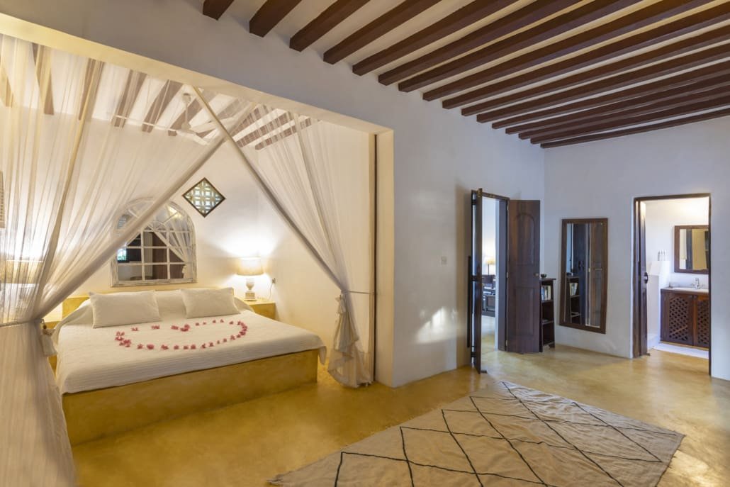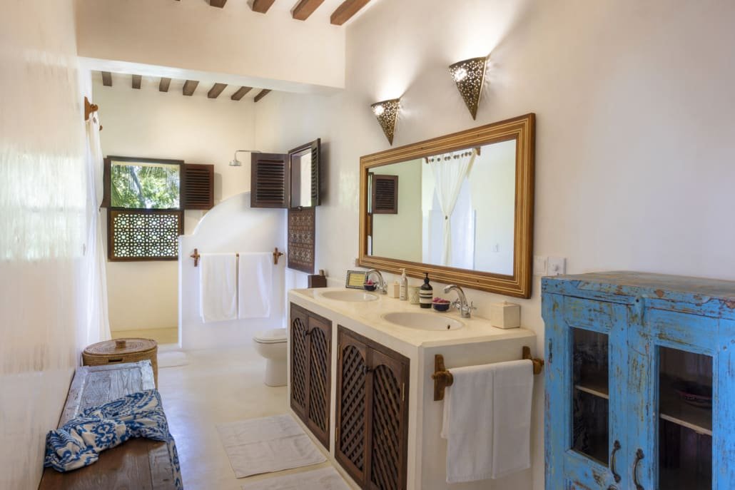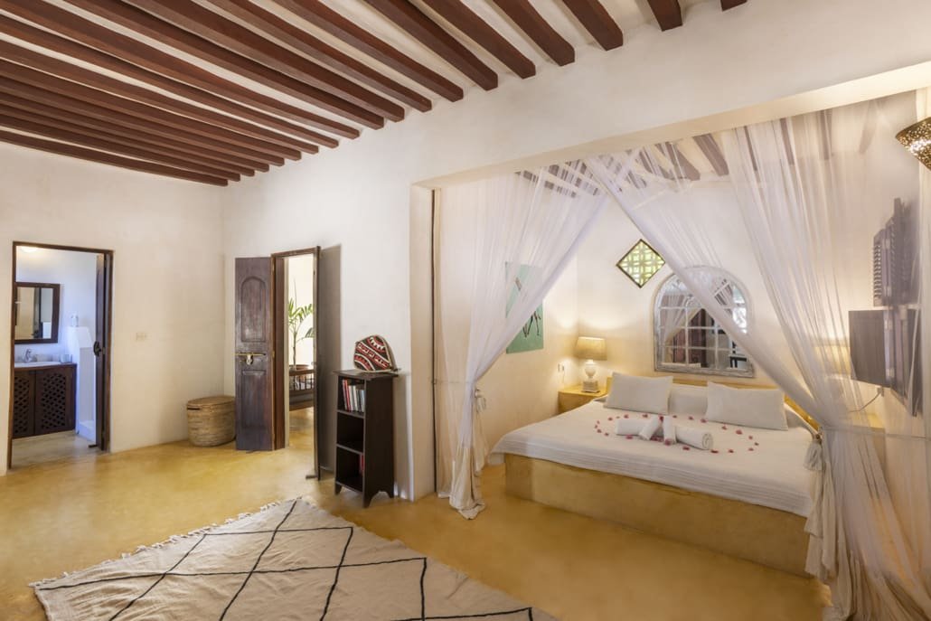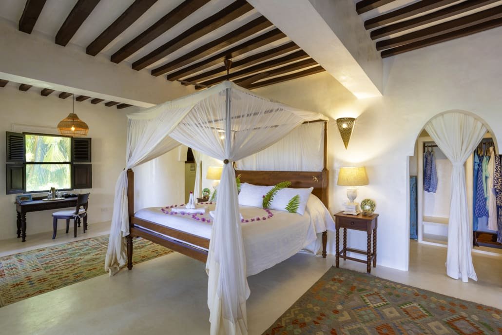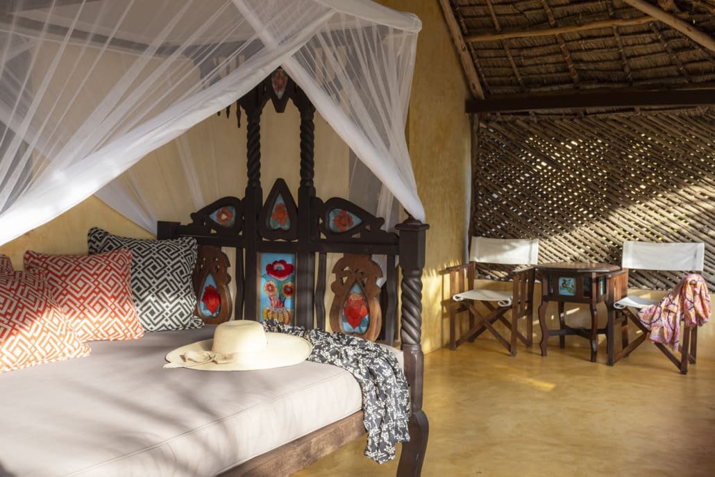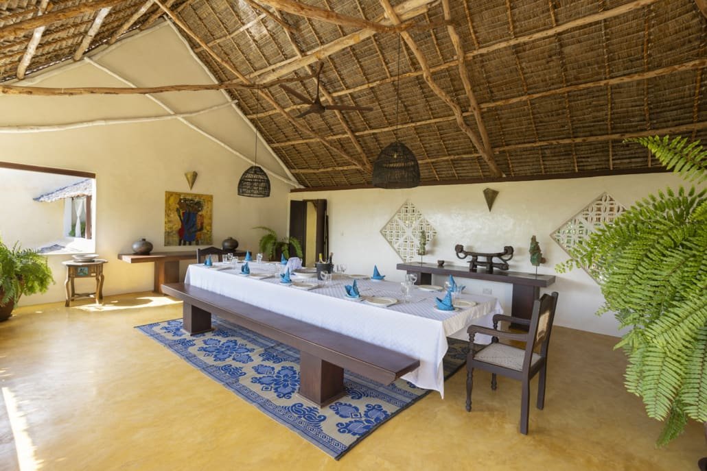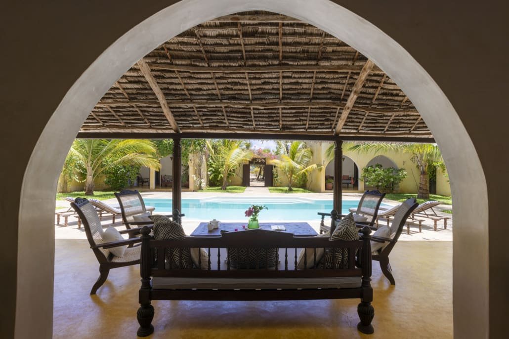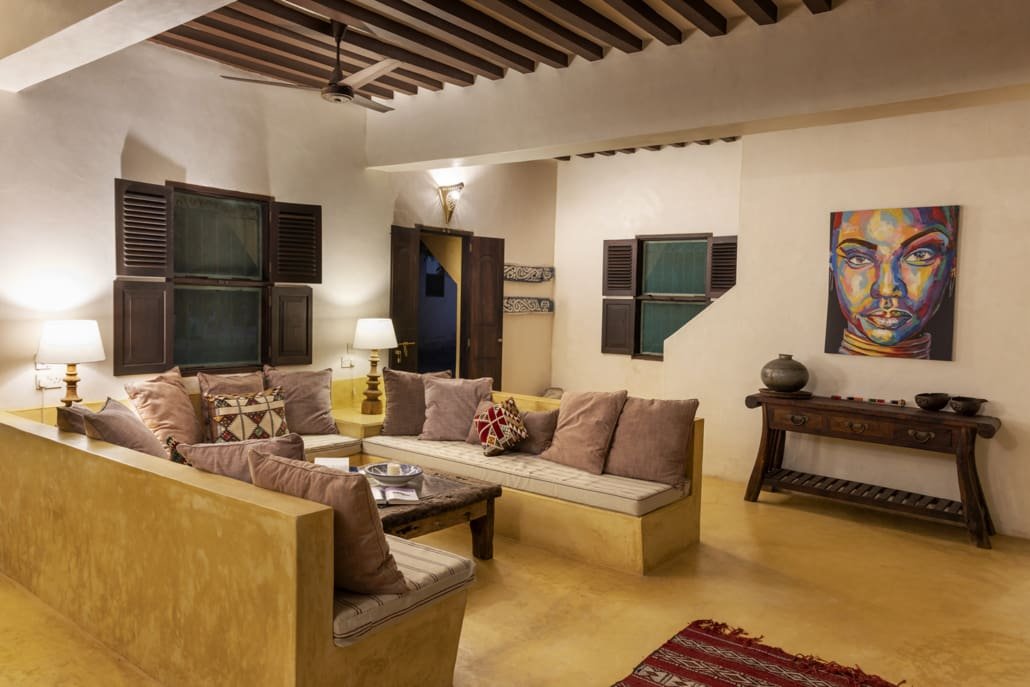 Entertaining areas are vast and cool, decorated with traditional carved plasterwork and sturdy hardwood furniture. Brightly patterned kanga-covered cushions invite you to sink onto expansive baraza seats or cool swinging beds that are so comfortable you never want to move. There are bookshelves and bars, intriguing local artifacts, generous pots full of bright green ferns and palms and the discreet, attentive staff, cheerfully carrying trays of fresh lime juice, afternoon tea or something stronger.