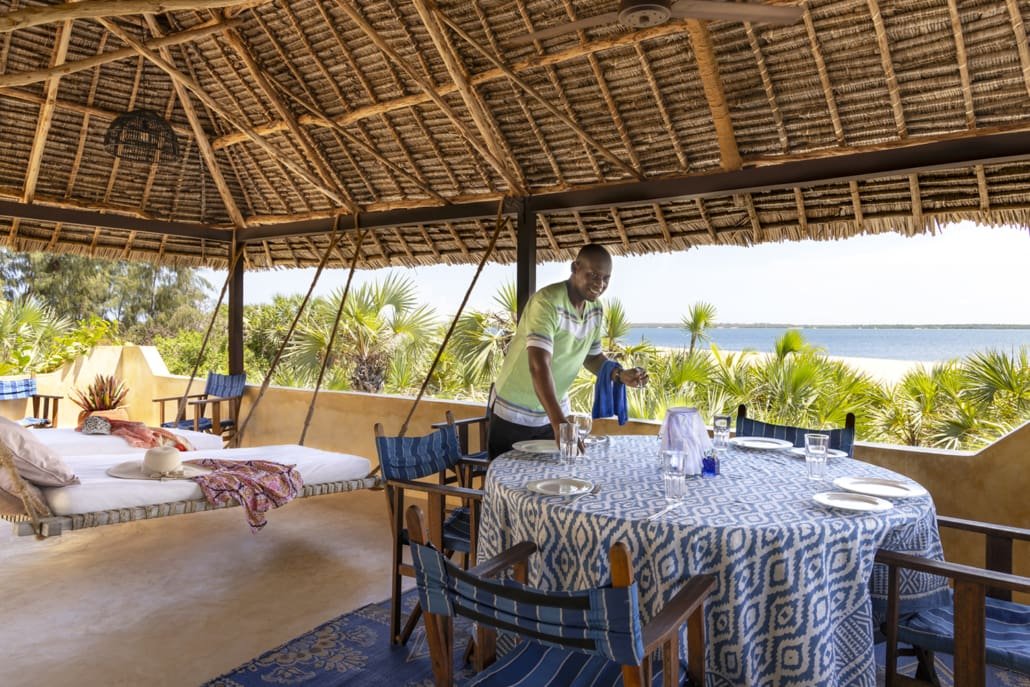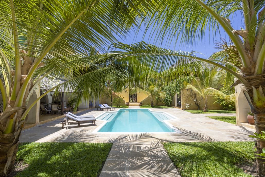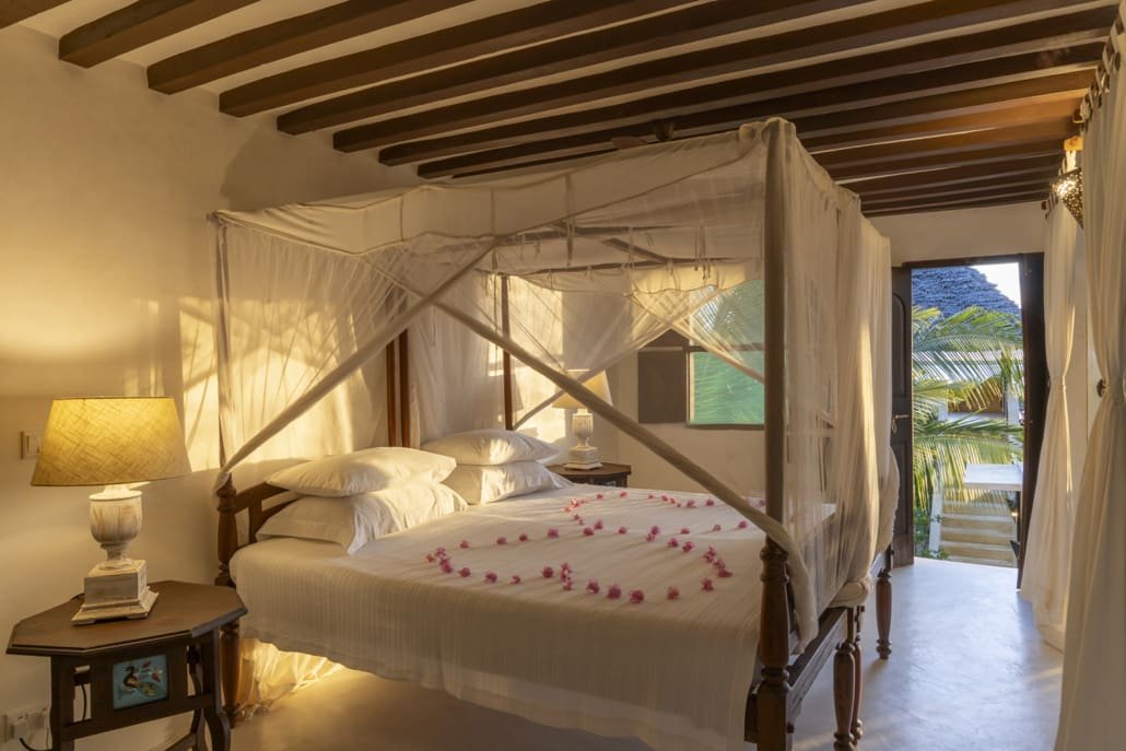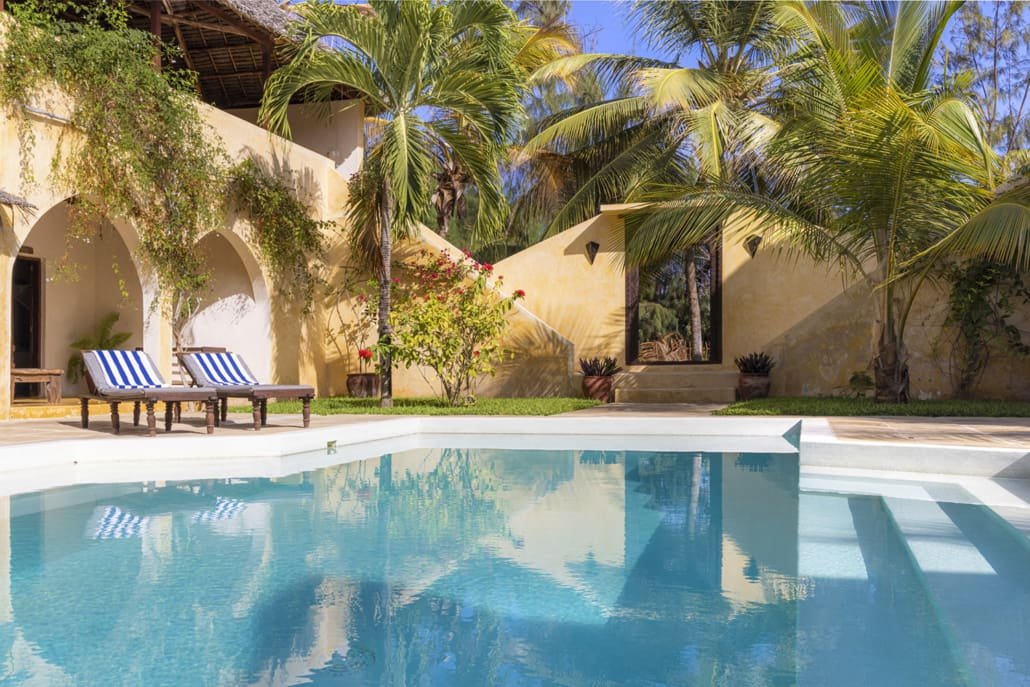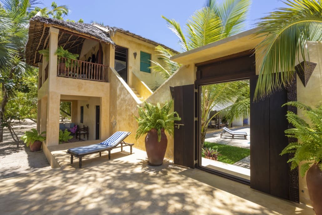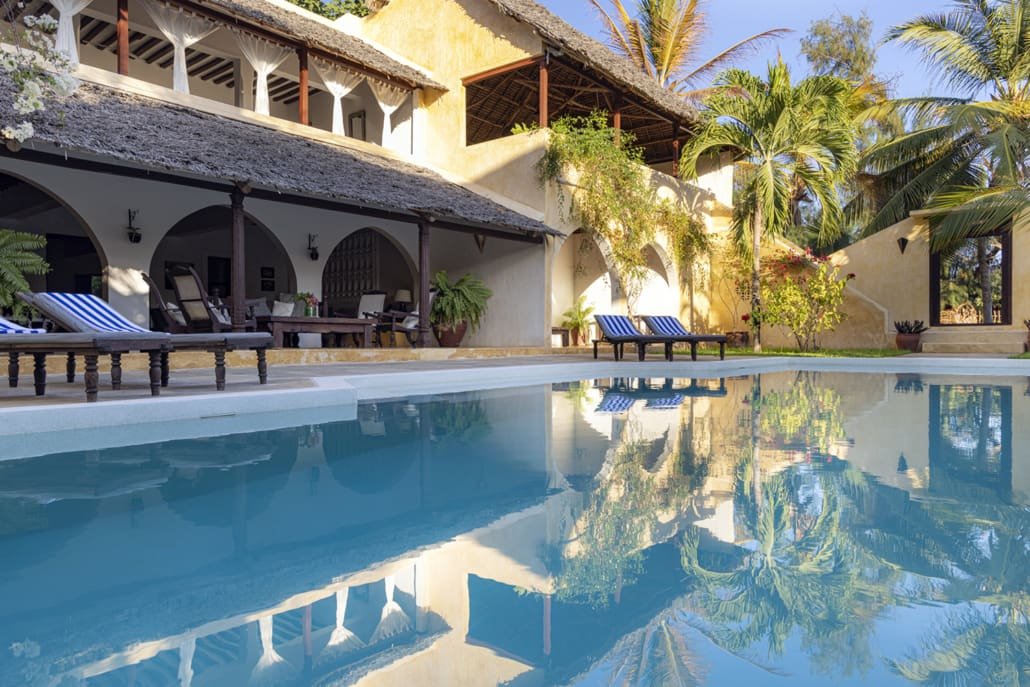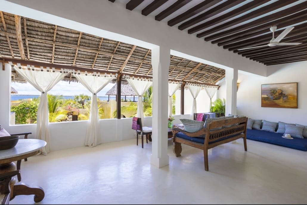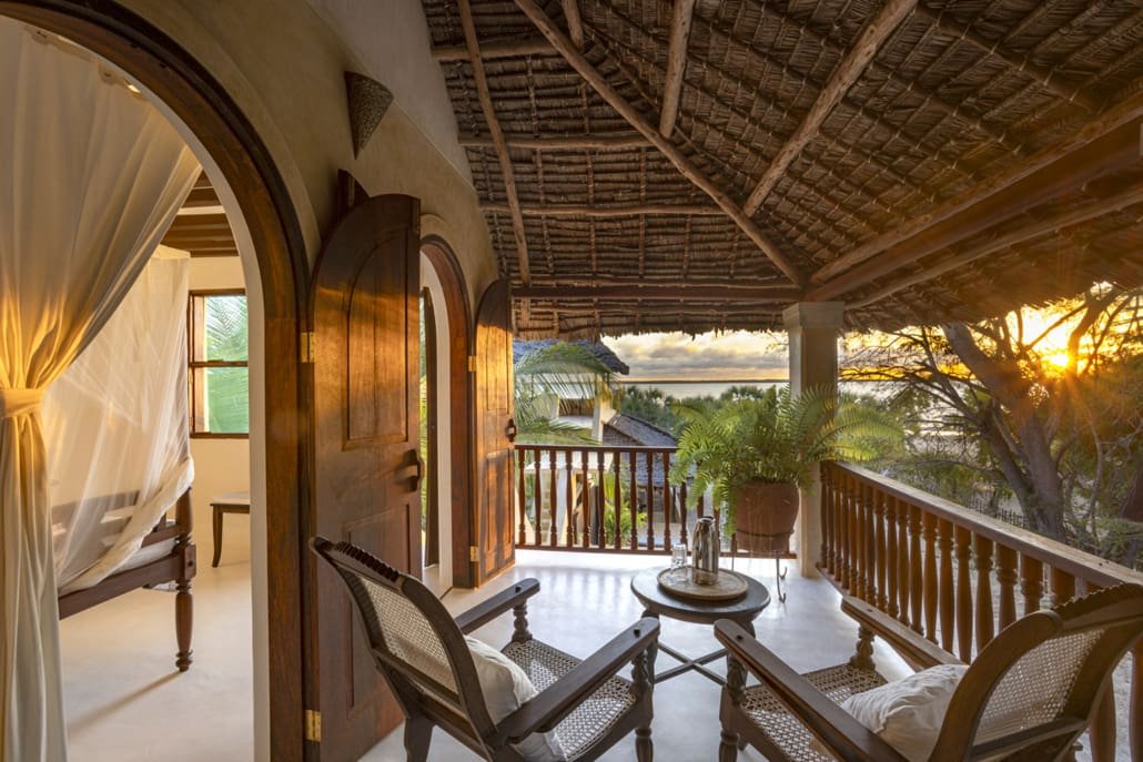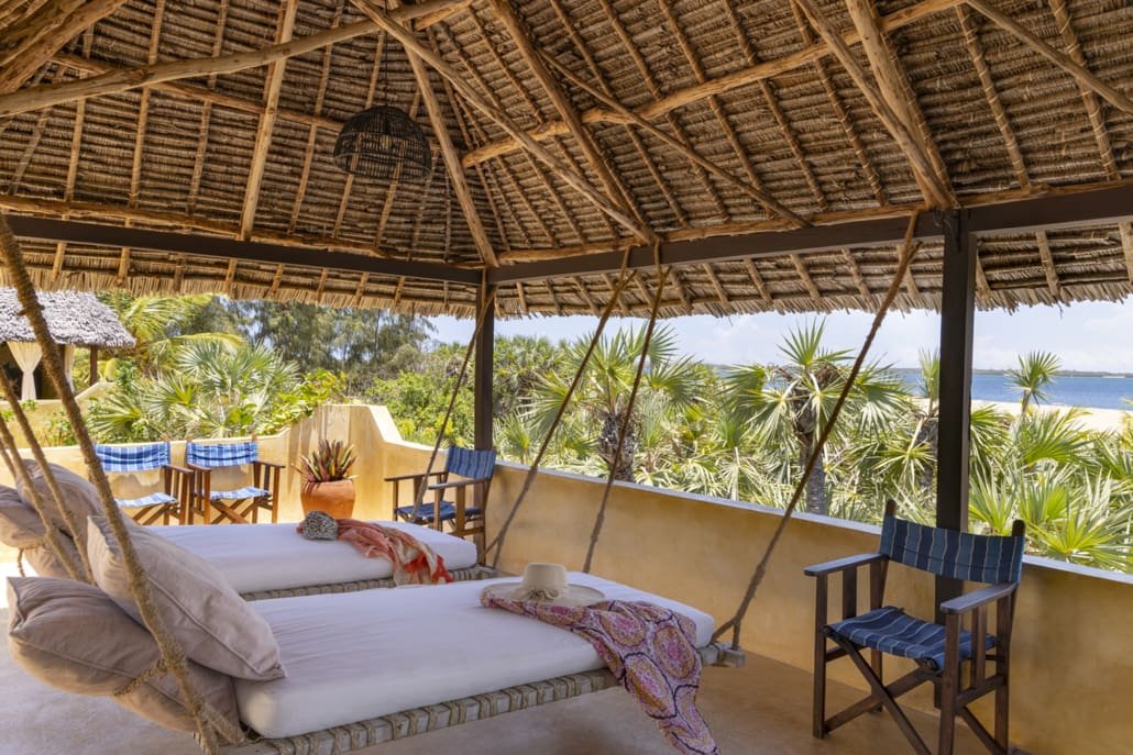 Entertaining areas are vast and cool, decorated with traditional carved plasterwork and sturdy hardwood furniture. Brightly patterned kanga-covered cushions invite you to sink onto expansive baraza seats or cool swinging beds that are so comfortable you never want to move. There are bookshelves and bars, intriguing local artifacts, generous pots full of bright green ferns and palms and the discreet, attentive staff, cheerfully carrying trays of fresh lime juice, afternoon tea or something stronger.