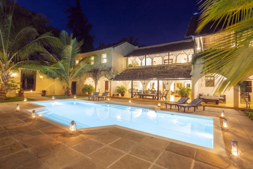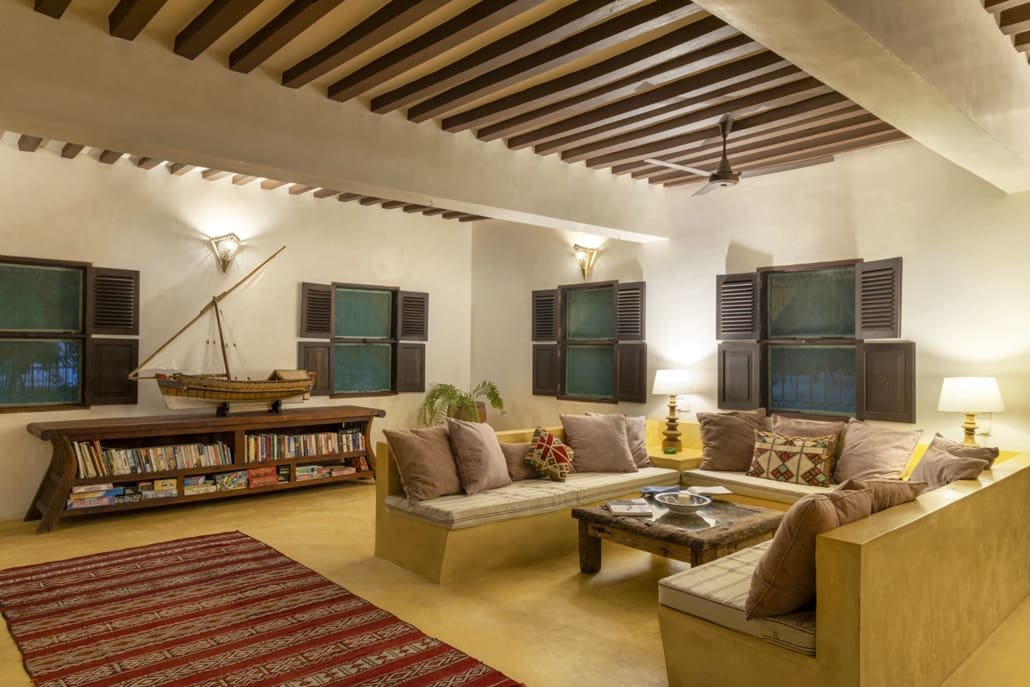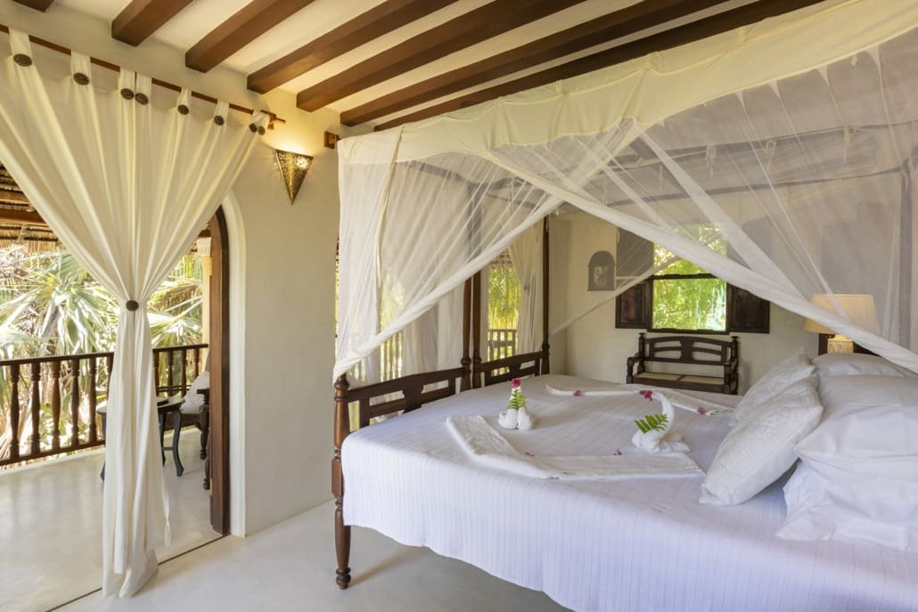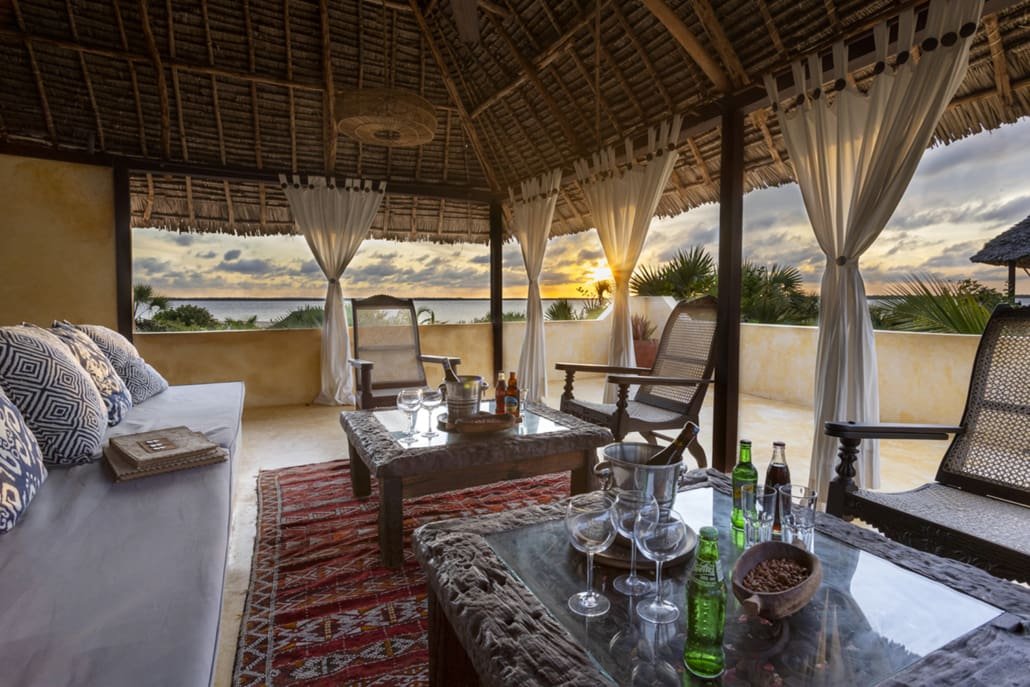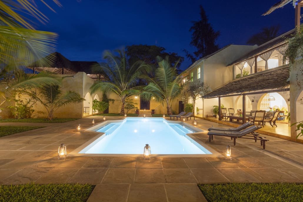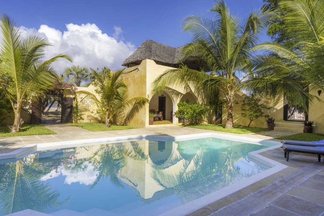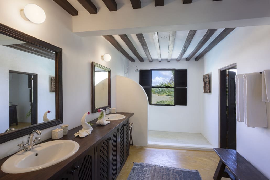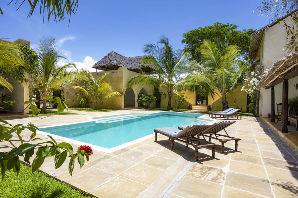 Entertaining areas are vast and cool, decorated with traditional carved plasterwork and sturdy hardwood furniture. Brightly patterned kanga-covered cushions invite you to sink onto expansive baraza seats or cool swinging beds that are so comfortable you never want to move. There are bookshelves and bars, intriguing local artifacts, generous pots full of bright green ferns and palms and the discreet, attentive staff, cheerfully carrying trays of fresh lime juice, afternoon tea or something stronger.