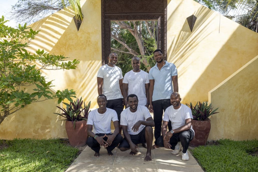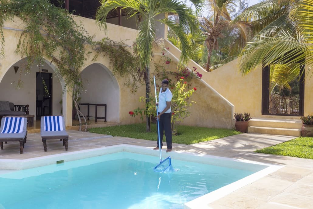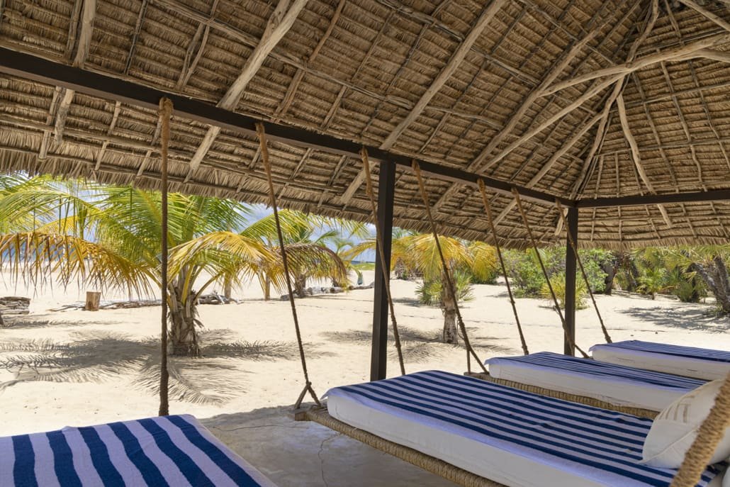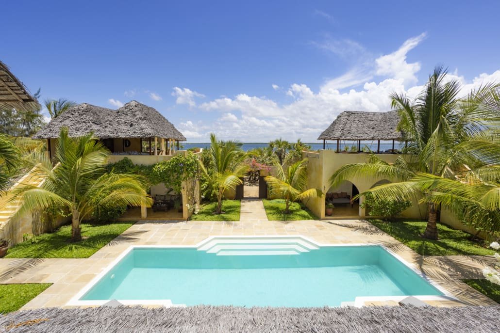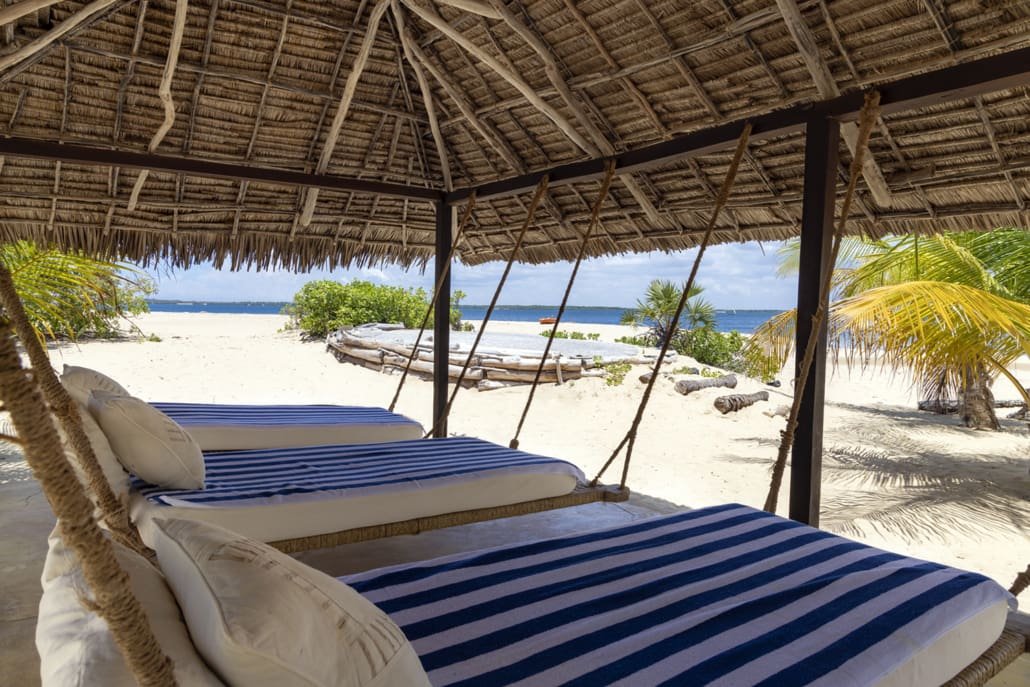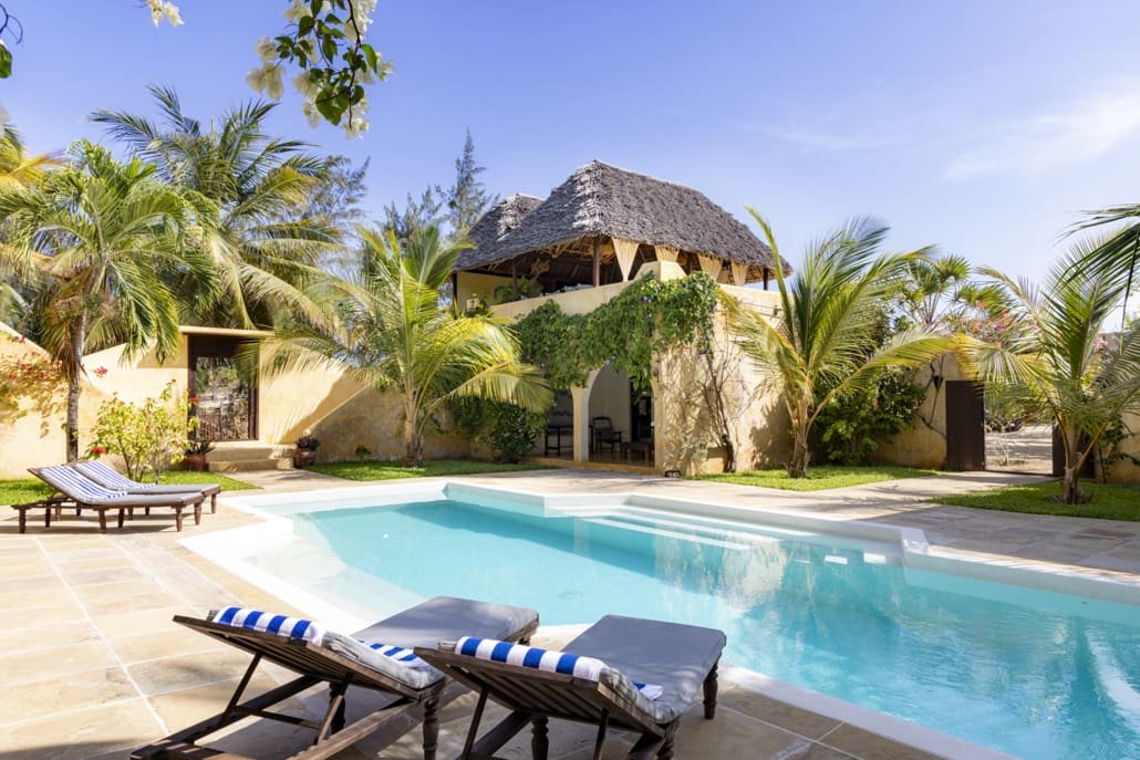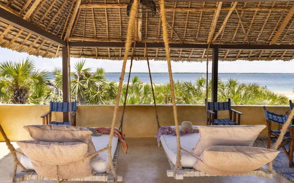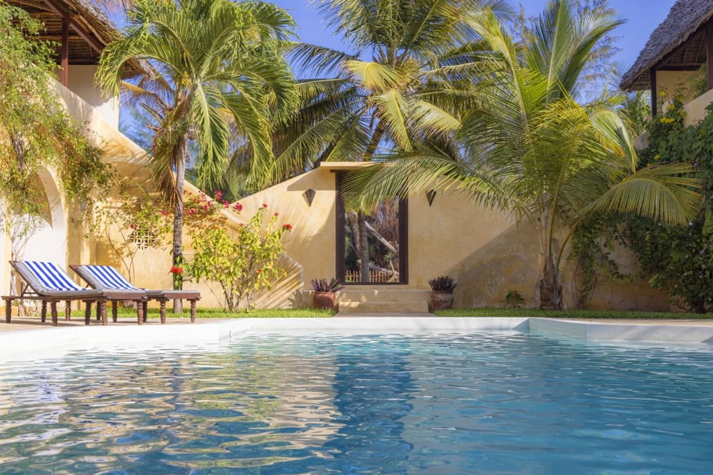 Entertaining areas are vast and cool, decorated with traditional carved plasterwork and sturdy hardwood furniture. Brightly patterned kanga-covered cushions invite you to sink onto expansive baraza seats or cool swinging beds that are so comfortable you never want to move. There are bookshelves and bars, intriguing local artifacts, generous pots full of bright green ferns and palms and the discreet, attentive staff, cheerfully carrying trays of fresh lime juice, afternoon tea or something stronger.