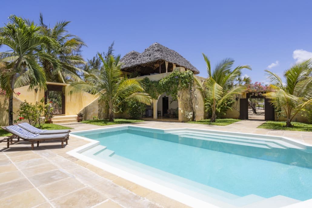 Wazi Dubu is the southern-most house on Kizingoni Beach. Its spacious, cool design and palm fringed position have made it a great favourite with families and groups of friends alike. Soft yellow walls, colourful shrubs and tall coconut palms around the central pool courtyard allow complete privacy and security, while the three elevated communal areas – the breakfast roof, sundowner baraza and main dining terrace – provide huge views of the ocean, the beach and the passing dhows.